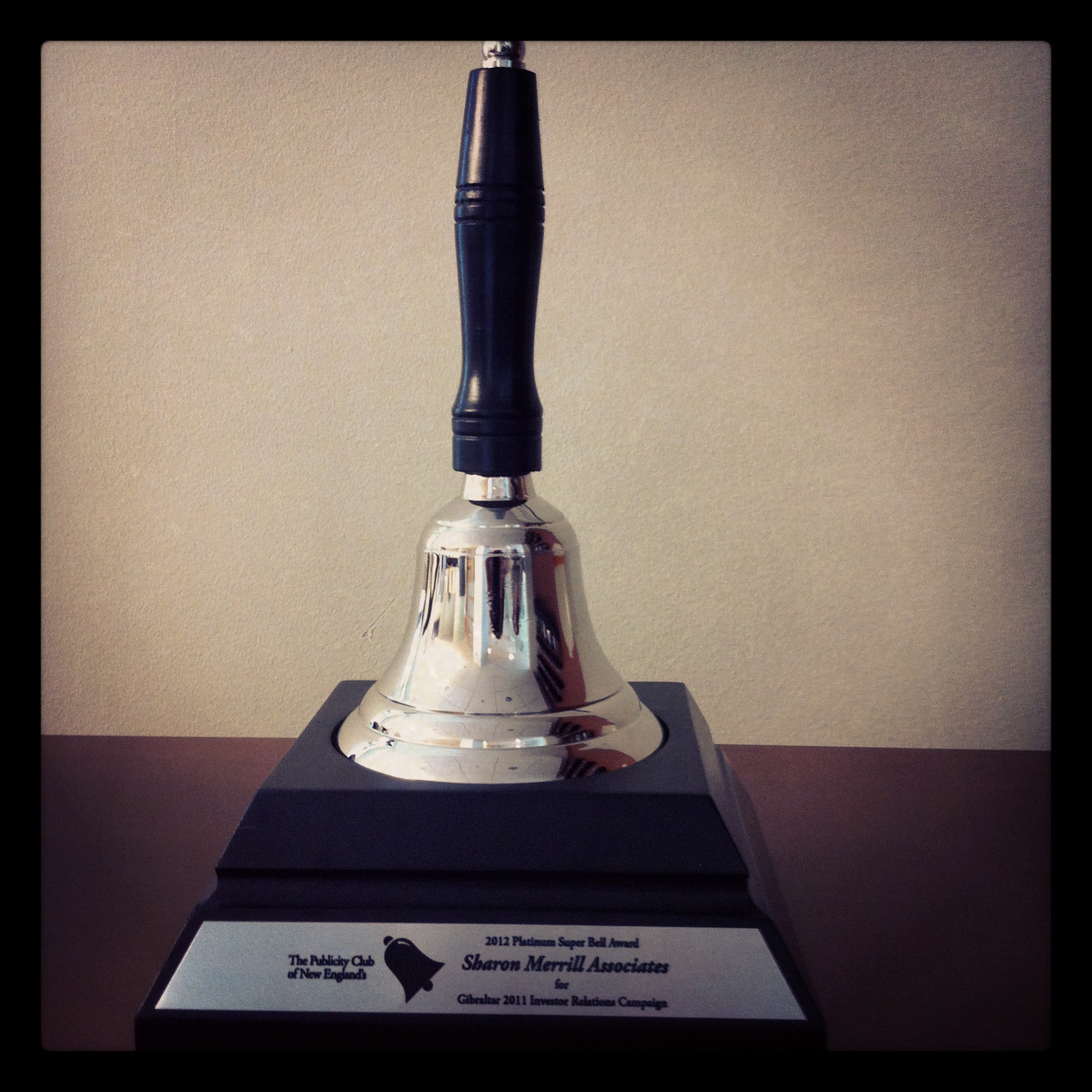 Sharon Merrill Associates on Monday captured The Publicity Club of New England’s coveted 2012 Platinum Super Bell at its annual Bell Ringer Awards, which annually recognizes the region’s most successful communications and public relations campaigns. We won the Platinum Super Bell for our investor relations program for Gibraltar Industries, recognizing us as “best in show” among the “Gold” winners in each of the 20 communications campaign categories. In addition, the agency also received a Gold Bell Ringer Award for best Investor/Financial Relations Campaign.